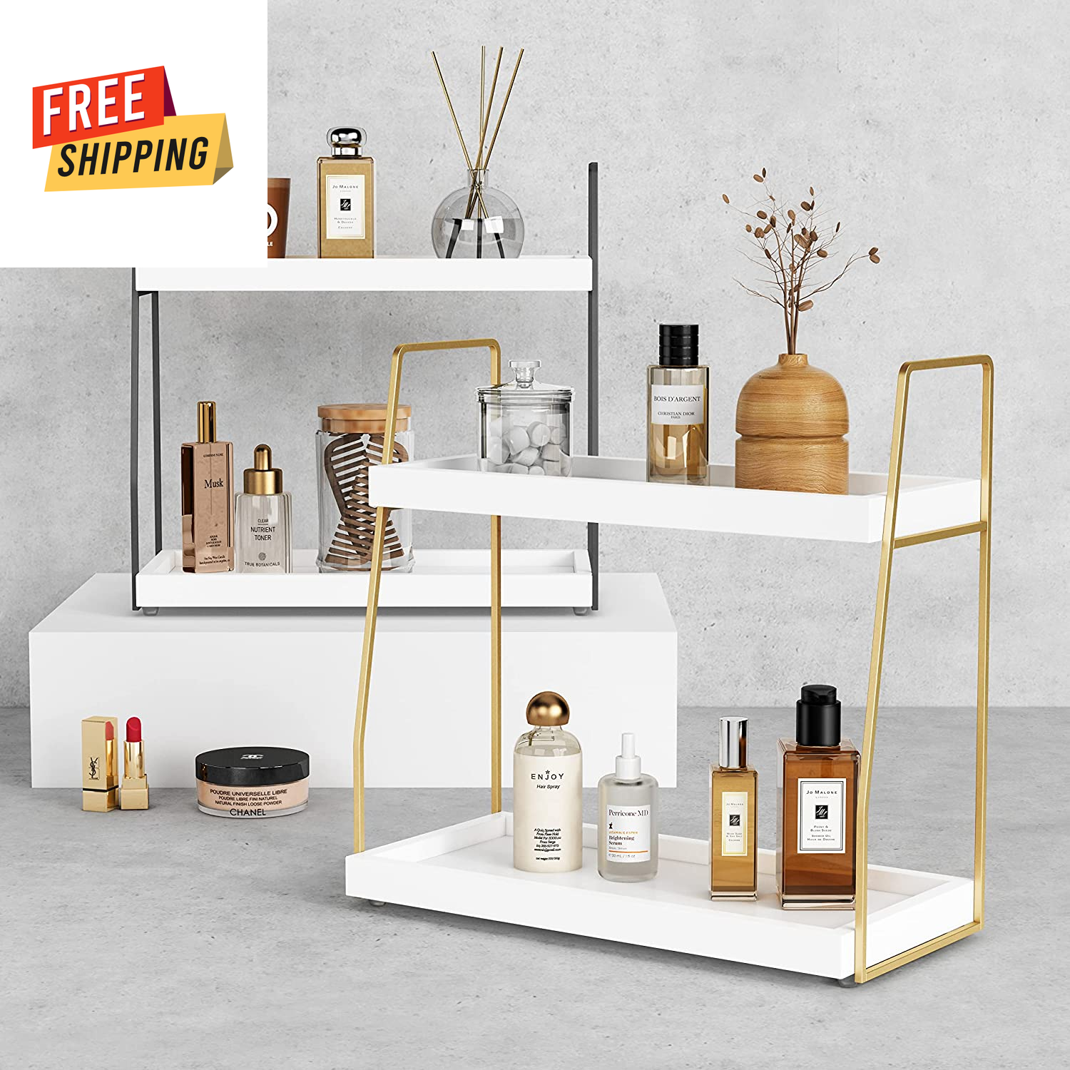 2-Tier White and Gold Bathroom Organizer Countertop - Wooden Sink Organizer Shel